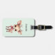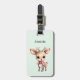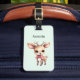 A luggage tag with an illustration of an adorable baby deer. Big eyes big ears with a large head and little brown antlers. Wearing a big red bow.