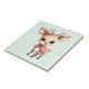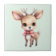 Ceramic tile with an illustration of an adorable baby deer. Big eyes big ears with a large head and little brown antlers. Wearing a big red bow.