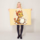Set against a warm beige circular background with soft white floating dots, the entire scene evokes feelings of comfort, safety, and magical coziness. The color palette of golden yellows, warm coral-oranges, creamy whites, and soft earth tones creates a soothing, inviting atmosphere perfect for children's products and cozy-themed items.