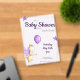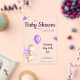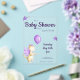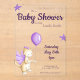 Adorable girly baby shower invitation with a fairytale feeling. The cute illustration of a baby dragon holding a purple balloon will be the delight for the mother to be. Illustrated and designed by Patricia Alvarez.