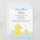 Start your baby boy baby shower, baby girl baby shower or neutral baby shower off right with our cute little baby duck with mum duck baby shower invitation. Our stylish & modern Invitation features an adorable mum & baby duck set on a white background with water and bubbles and has a blue & white polka dot border. The back of our mum & baby duck baby shower invitation features a matching modern yellow background. Visit our shop for a large selection of baby shower invitation for boys, girls or a gender neutral baby shower. ©Blackleaf Designs