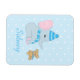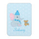 Magnet with cute baby elephant and teddy bear. The elephant is wearing a blue striped winter hat and winter scarf and the teddy is wearing a matching scarf. The design is completed by dot background. The design is customizable and you can personalize the text.