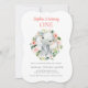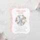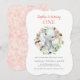 An adorable birthday party invitation for a little girl's first birthday, this design has a baby elephant in soft watercolor grey with big floppy ears and large beautiful eyes surrounded by a wreath of blush pink and white roses and greenery. The text template is fully editable for you to personalise with your child's name and party details. The reverse side of the invitation is a coordinating pink marbled pattern to match the flowers and pink text on the front.