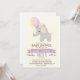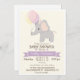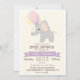 Cute baby elephant with pastel pink, purple, and yellow balloons; girl baby shower invitation. Personalise this cute, retro feel invite; can be for girl baby shower or can be change to baby sprinkle. Cute, simple, plain design. Features elephant, lavender purple ribbon and hearts, brown font, and off white background. Great for jungle animal, zoo animal, or safari theme baby shower or sprinkle!