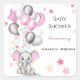 A cute baby shower art featuring a baby girl elephant with pink ears holding balloons in pink, white and silver colours.