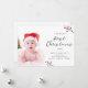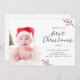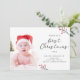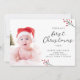 Cute baby first Christmas photo holiday card, perfect for sharing the joy of your child's first Christmas. The design is accented with festive red berry sprigs in the corners, adding a subtle holiday touch. Personalise the card with your baby’s name, family name, and year. Replace the sample photo with your own to create a unique and memorable greeting.