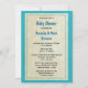 A turquoise blue baby shower invitation. The background is a faded pattern of little baby blue footprints. The back has a fashionable mummy pushing her baby carriage while venturing into the city. Personalise with all your party details.