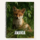 Spiral notebook with a photograph featuring a cute little baby fox with red and white fur. Surrounded by lush green leaves and grasses.
