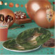 Paper plates with a photograph featuring a cute little baby fox with red and white fur. Surrounded by lush green leaves and grasses.