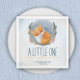 A little one is coming this winter. Cosy winter watercolor design featuring modern handwritten style script, orange cute sleeping baby fox on snowly background. The text can easily be personalised for a unique one of a kind design for your special day.