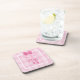 A cute 'It's a girl' birth announcement coaster set with a trendy pink argyle pattern background, embellished with sweet little baby footprints and a girly pink ribbon tied into a bow. Replace customisable text with your new baby girl's name.