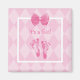 A cute 'It's a girl' birth announcement magnet with a trendy pink argyle pattern background, embellished with sweet little baby footprints and a girly pink ribbon tied into a bow. Perfect party favour for a little girl baby shower.