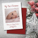 Modern First Christmas greeting card, with a cute baby girl theme and customisable red typography lettering. With a photo template, you replace with your own baby photo. Great for announcing your growing family this holiday season.
