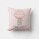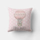 Cute custom baby girl elephant decorator pillow for the infant nursery or toddler bedroom. This adorable little princess elephant is floating in a pink hot air balloon. The background is a white polka dot pattern on pink. Personalise by adding your child's name. Contact me for help with customisation or to request matching or coordinating products.