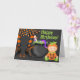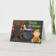 This Halloween themed Happy Birthday greeting card features a cute baby in a pumpkin costume with mum witch legs and a creepy cauldron.