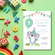 These cute birthday party invitations feature a cute baby koala wearing a party hat and holding a balloon with party flags decoration. Personalise the birthday party invites by adding your child's name, age, and party details.