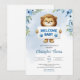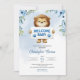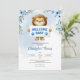 Welcome to an enchanting invitation design for a baby shower, celebrating a new baby boy. This charming design features an adorable illustration of a cute baby lion gently holding a "welcome baby" sign. Adding to the whimsy are dainty light blue flowers and fragrant eucalyptus embellishments. This visual delight, with its tender humour and soft colour palette, has been thoughtfully designed to add grace and fun to your special celebration.