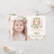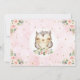 This feminine design features an illustration of a pretty baby owl surrounded by gorgeous watercolor blush pink roses and gold glitter confetti
