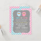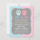 Invite your guests to share in your special news! Boy or Girl? Keep them guessing till the baby shower event where mummy to be announces herself! This elegant and classy invitation has two baby owls one owl is in blue and the other in pink. Gender neutral grey background so as not to give the gender away. Background of blue and white chevron zigzag pattern on one side and pink and white chevron zigzag pattern on the other. Personalise easily with your party details.