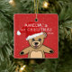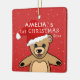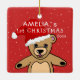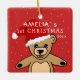 Cute Baby`s First Christmas Teddy Bear Santa Hat Ceramic Ornament. Cute teddy bear with a red Santa hat. The background is a red with white snowflakes. Easy personalise with your name and year of birth.