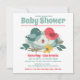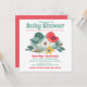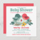 A Cute Baby Shower Invitation designed with a family of sweet birds coloured in shades of red and green on a white background. the reverse is a matching bright red. To personalise, simply replace the sample text using our easy template to complete all your details.