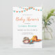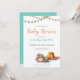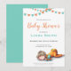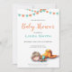 Cute baby shower invitation in neutral colours. The illustration has a baby sleeping and some orange and turquoise garlands. Personalise the text with your own. Illustrated and designed by Patricia Alvarez.