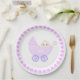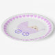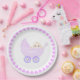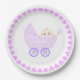 Cute baby stroller and hearts in violet colour on white background paper plate. Baby text can be personalised. Ideal for baby parties, baby birthday or baby shower.