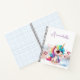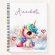 This magical and enchanting custom notebook features a cute baby unicorn with rainbow hair and big eyes. The sweet little unicorn is sitting on a blue and pink glitter cloud, and several pink foil hearts are floating beside her. A sample name is printed at the top which you can personalise to include your own custom name or text.