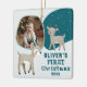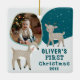 Cute Baby's 1st Christmas Photo Reindeer Ceramic Ornament. Celebrate a precious milestone with this adorable personalized baby's first Christmas ornament. Featuring a charming woodland deer design and festive 'First Christmas' text, it's the perfect way to commemorate your little one's first holiday season. Easily customize with your baby's photo and name, creating a truly unique keepsake. This ornament makes a cherished gift for new parents or a beautiful addition to your family's Christmas tree.