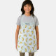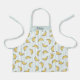 This blue and white kids apron features a cute pattern of hand-drawn bananas against a pink and white stripes background. Personalise with child's name.
