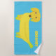 It's a dog! It's a banana! It's a dog made out of bananas! This beach towel has a funny illustration of a dachshund dog that's made out of yellow bananas set against a bright blue background. There's a spot to add a name in matching yellow lettering.