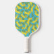 This personalised pickleball paddle (say that three times fast!) is bananas. On the front is an illustration of a cute dachshund style dog made out of yellow bananas. There's a spot to add a name below the graphic. On the reverse side is a coordinating pattern of bananas dogs along with some green tropical palm leaves against a bright blue background.