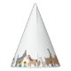 Cute barnyard birthday party hats featuring a simple white background, adorable farm animals including a cow, goat, pig, sheep, donkey, horse, rabbit, duck & a rooster, the saying "happy birthday", and the childs name.