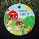 Give your little farmer her own special custom barnyard Christmas ornament! Holiday ornament has a cow, pig, sheep, cat, chicken, horse, and duck. Smiling in the corner is a bright yellow sun and in the foreground is an apple tree and young farmer kid. The pig has baby piglets and the sheep has a little lamb. Personalise the ornament with your young girl's first name on the front and the year on the back.