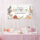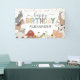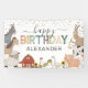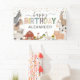 Cute barnyard petting zoo birthday banner featuring a simple white background, adorable farm animals including a cow, goat, pig, sheep, donkey, horse, rabbit, duck & a rooster, the saying "happy birthday", and the childs name.