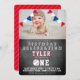 Cute Baseball Chalkboard Kids Photo 1st birthday invitation. The card has a baseball theme - baseball and red, blue and white bunting flags. The background is a trendy chalkboard and the backside of the card is red. Personalise the card with the child`s photo and customise the text.