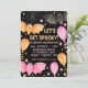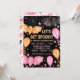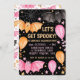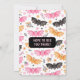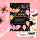A spooky cute pastel halloween party invitation featuring spooky cute bats, balloons, spiders webs and confetti in pastel pink and orange on a black background. Customise it today! See the whole matching party collection.