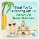 This beach baby shower Thank You sticker features a cute baby sipping a lemon aid, standing with a sand bucket, an impressive sandcastle and beach ball surrounded by tropical palm trees. It can be personalised with a name and any text that you wish to add. Some graphics by artwork©delightful-doodles.com and CherylSeslarDesigns.com at DigiWebStudio.com.
