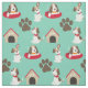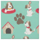Fabric kids will love, features an aqua background with various beagle dogs, one in a dog bed, as well as brown dog paw prints and dog houses with a bone hanging over the door! Little dog lovers who love beagles will love this fun fabric!