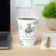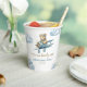 These cute baby shower paper cups feature a boy teddy bear flying a plane among fluffy clouds with text "We can bearly wait" and customisable shower details.