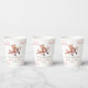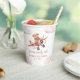 These cute baby shower paper cups feature a girl teddy bear flying a plane among fluffy clouds with text "We can bearly wait" and personalised with your shower details.