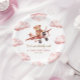 These cute baby shower paper plates feature a girl teddy bear flying a plane among fluffy clouds with text "We can bearly wait" and personalised with your shower details.