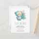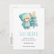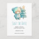 Save the date postcard with an adorable illustration. A cosy bear with stars and sparkles in its fur. Standing beside a Christmas tree. Pastel blue-green colour. Whimsical and cute.