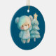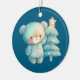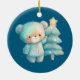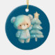 An ornament with an adorable illustration. A cosy bear with stars and sparkles in its fur. Standing beside a Christmas tree. Pastel blue-green colour. Whimsical and cute.