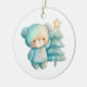 An ornament with an adorable illustration. A cosy bear with stars and sparkles in its fur. Standing beside a Christmas tree. Pastel blue-green colour. Whimsical and cute.