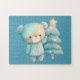 A puzzle with an adorable illustration. A cosy bear with stars and sparkles in its fur. Standing beside a Christmas tree. Pastel blue-green colour. Whimsical and cute.