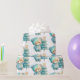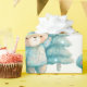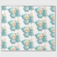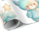 Wrapping paper with an adorable illustration. A cosy bear with stars and sparkles in its fur. Standing beside a Christmas tree. Pastel blue-green colour. Whimsical and cute.