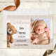 Baby birth announcement card featuring a photo of your own baby framed by a pastel beige grey striped design with a cute teddy bear. A beautiful gender neutral card to introduce your baby to the world.
