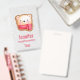 A name tag with a cute and adorable bear face set on a cookie base. Wearing a red and white striped scarf.