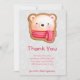 Flat thank you card with a cute and adorable bear face set on a cookie base. Wearing a red and white striped scarf.